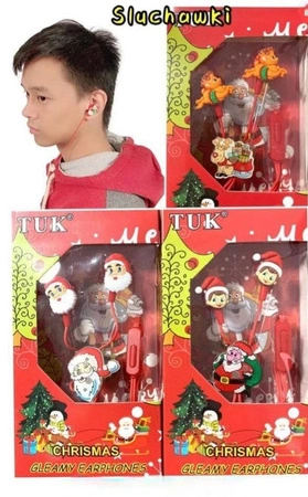 Słuchawki douszne z nakładkami z motywem świątecznym.