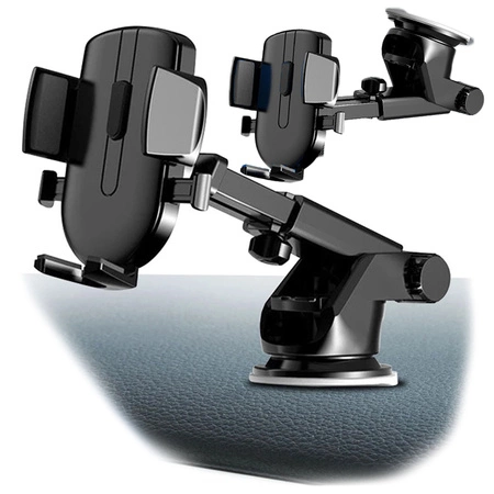 - Uniwersalny uchwyt samochodowy na smartfon do deski rozdzielczej i szyby wyposażony w regulowane ramię.