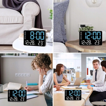 - Duży, czytelny wyświetlacz LED: Wyraźny wyświetlacz z dużymi cyframi zapewnia łatwy odczyt godziny, daty i temperatury z dowolnego miejsca w pomieszczeniu.